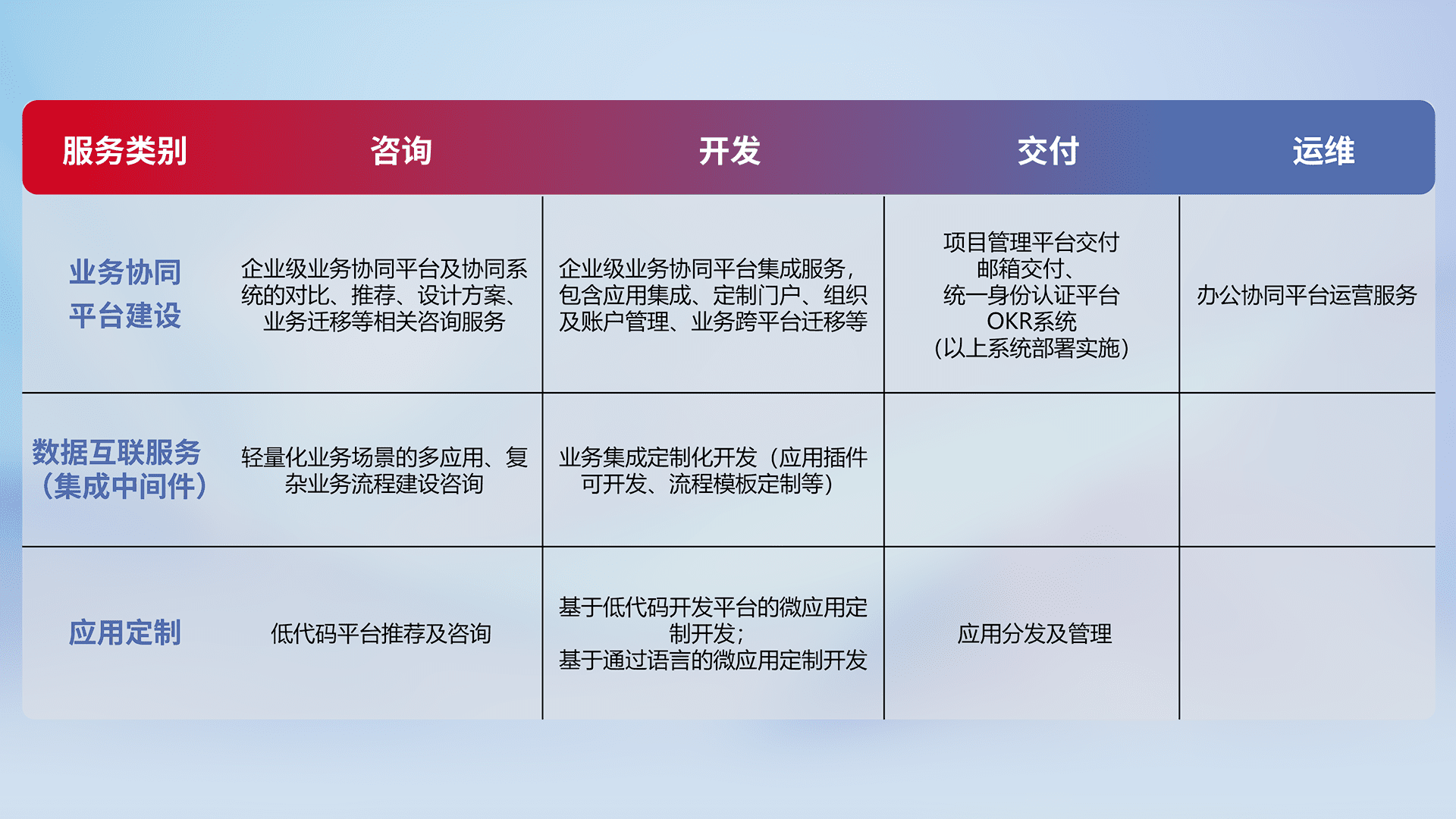 针对钉钉、、企微、、IDaas等平台级产品提供产品的规划、、、方案、、交付、、、、定制化开发等服务,,,实现如统一协同办公、、智能客户服务、、、混合会议管理、、、智能数据查询、、等业务场景,,,实现数字化转型。。。